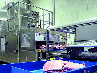 Ventajas: La descongelación por RF es un método rápido y eficaz que evita el desperdicio de producto y ahorra tiempo en comparación con los sistemas de descongelación convencionales. A diferencia de estos últimos, que son lentos y derrochadores debido a un control deficiente del proceso, la descongelación por RF es endógena e instantánea. El producto a descongelar se coloca en la cinta transportadora de la máquina de RF y se somete a un rápido calentamiento dieléctrico que sitúa su temperatura justo por debajo del punto de fusión del agua, evitando pérdidas por goteo y deterioro bacteriano. Además de preservar la calidad, este método facilita la gestión de pedidos de última hora y elimina las manipulaciones múltiples, lo que supone un importante ahorro en costes de mano de obra.